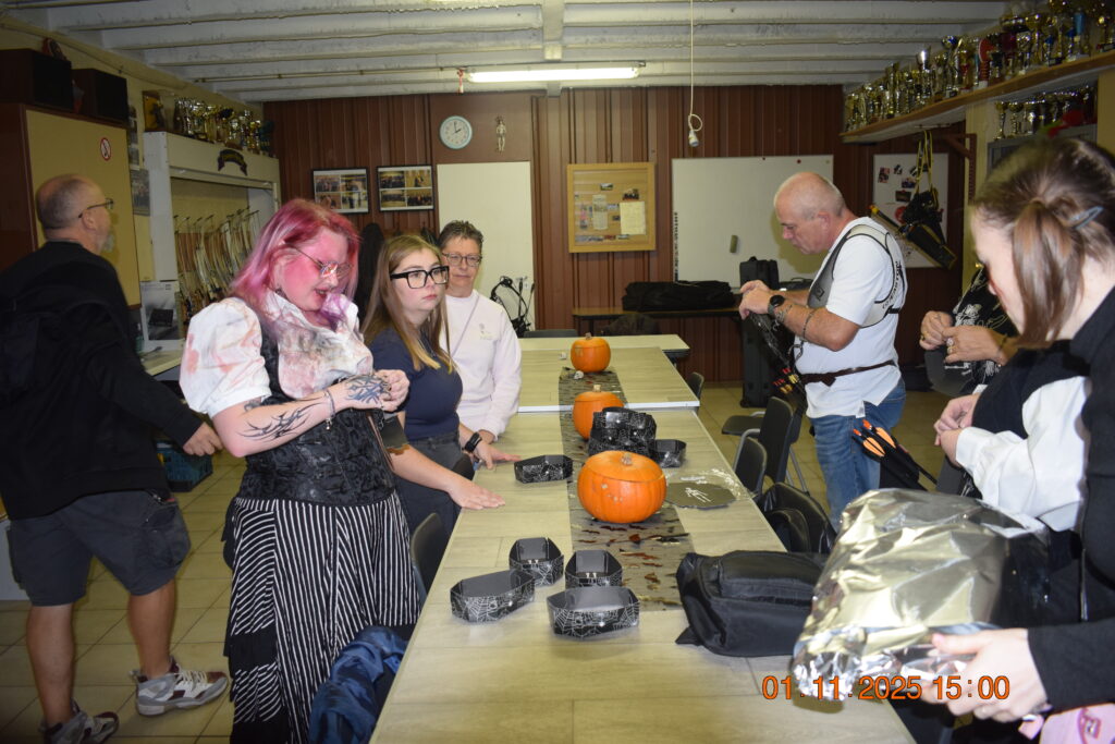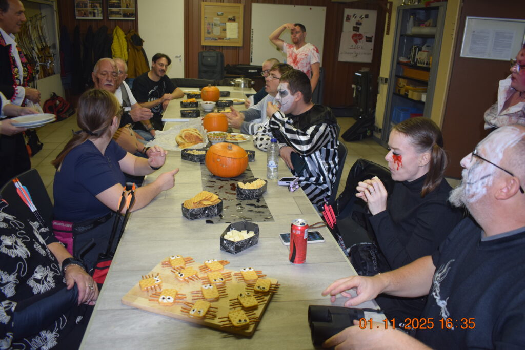 Pendant et après le tir nous avons pu déguster quelques petites horreurs comme des araignées et des doigts de sorcières fraichement récoltés et cuisinés (les absents ont eu tort de ne pas être présents) ainsi que d’autres crasses servies dans des cercueils. Sans oublier la marmite avec le délicieux breuvage au potiron.